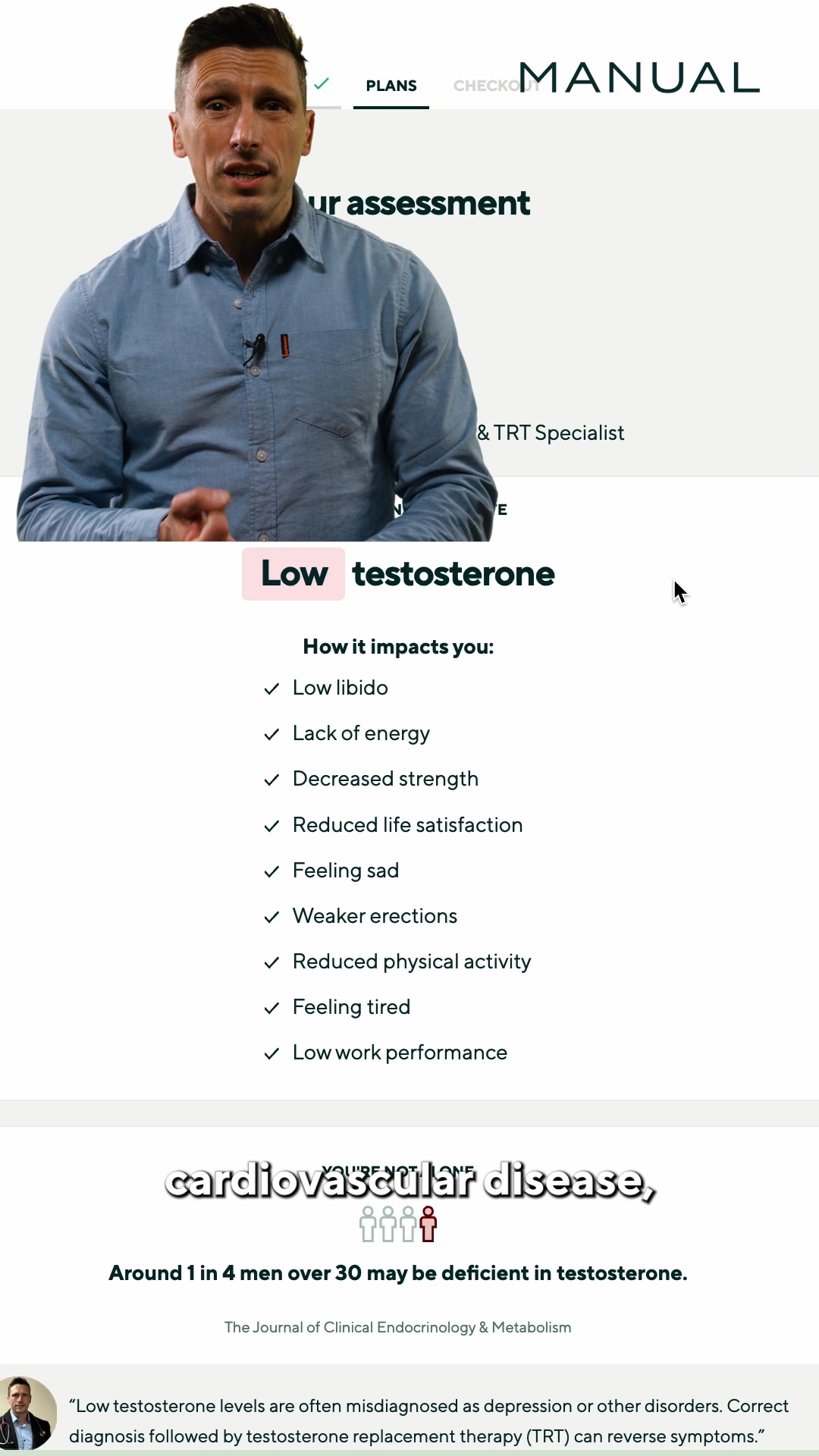 We're MANUAL 👋 We help men treat low testosterone. Order a Blood Test Kit today and get valuable insights on your daily hormone levels to find out if you're eligible for our TRT service. As a bonus, we're giving you 38% off your first order 🙌